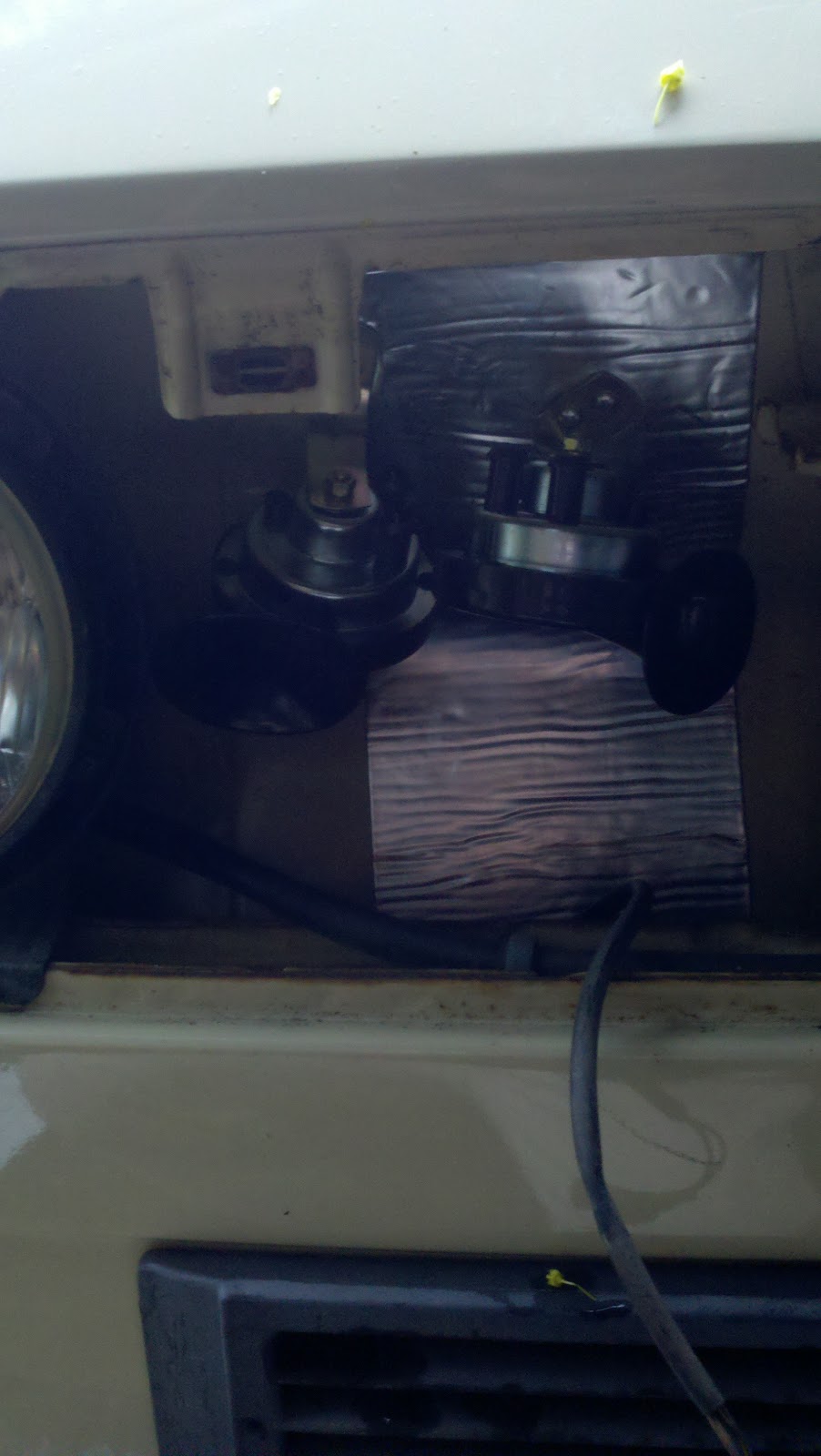 Horns are now working. Its all about the grounds in this van. I have been cleaning every ground I come across in attempts to avoid any issues. They are badly coated. The horns themselves are an aftermarket version of a low and high note combination. They do not sound German, but since I really want the Cadillac 4 note horn setup, I will deal with this until I can procure the set. I installed behind the upper grille rather than the stock location underside.